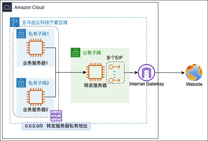 对于第二种类型,如果需要的公网 IP 数量少于或等于 8 个,可以使用 Amazon NAT Gateway 实现;若需要的公网 IP 数量大于 8 个,则需要更加灵活的方案。